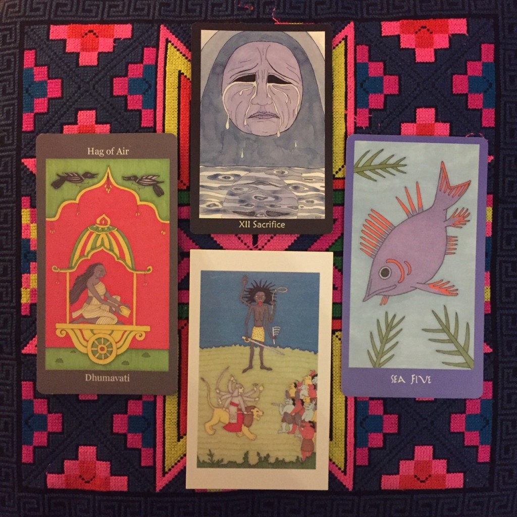 Dear Collective, this month I was inspired by a Facebook post by Ellen Lorenzi-Prince: she did a reading for these times, pulling one card from each of her tarot decks (plus one from her latest deck – the She Who Watches Oracle. I am currently awaiting its arrival in my letterbox!). I asked for her permission to do this style of reading for this month’s Tarot Reading for the Collective, which she graciously granted.